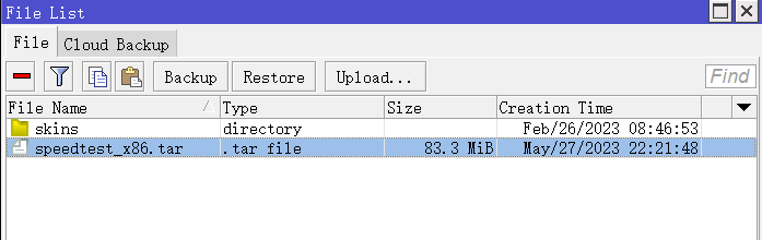 上传speedtest_x86/arm64.tar文件到File存储目录下,具体存放在RouterOS本地存储,还是外部存储器(USB扩展/Nvme),根据设备具体情况确认,使用winbox时,通过文件拖放到File下,也可以使用upload按钮