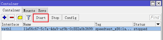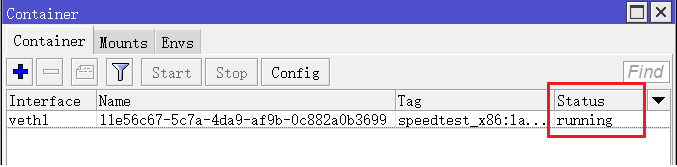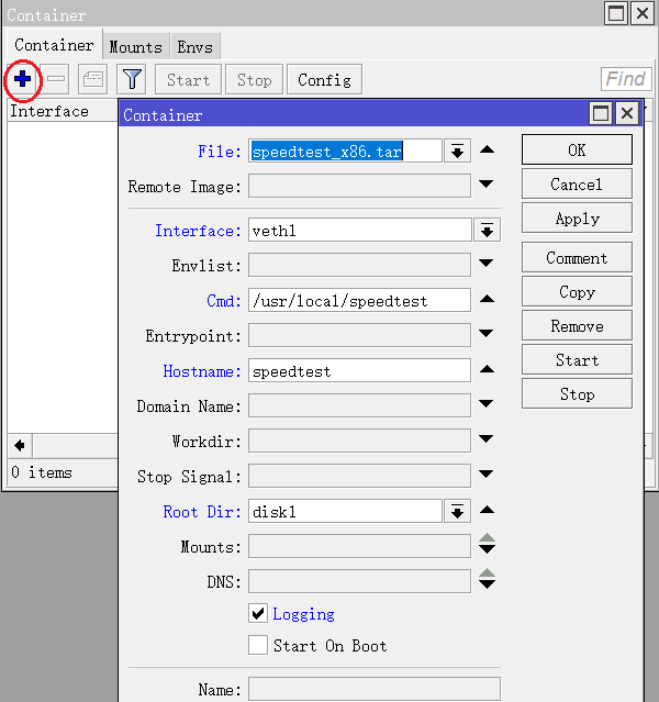 进入container添加一个容器项目,File指定刚才上传的文件speedtest_x86.tar,interface:选择容器的网口为veth1,Cmd:需要指定运行speedtest的路径,Hostname:主机名称随意,Root Dir:需要指定容器存放的路径,指定一个目录disk1,如果是RB或者CCR设备指定到外部存储设备上,不用指定到本地存储,至于x86或者CHR平台,根据自己系统盘分配空间情况,也可以挂载扩展存储。