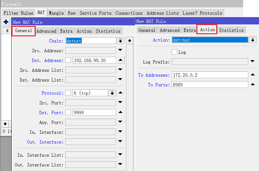 如果需要映射到外网,需要配置nat映射,进入ip friewall nat下配置,如下面的配置是,选择chain链表为dstnat,dst-address设置192.168.99.30表示我的外网地址,Protocol指定tcp协议,dst-port端口设置9999,在action下选择dst-nat,to-addresses为对应的容器IP地址,to-ports就是speedtest http页面的访问端口8989
