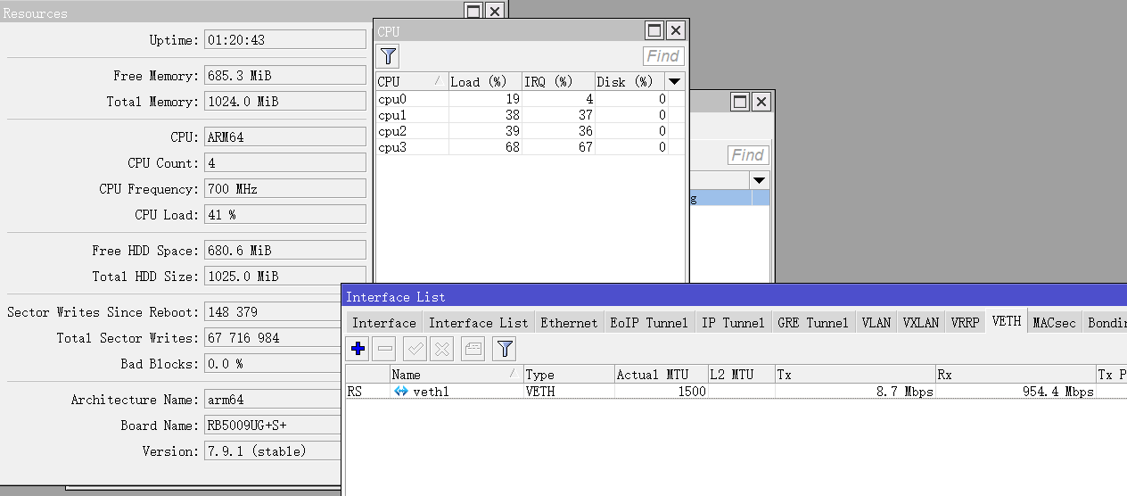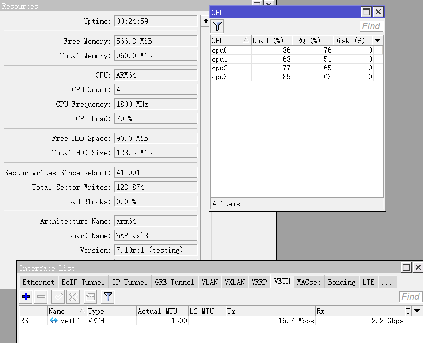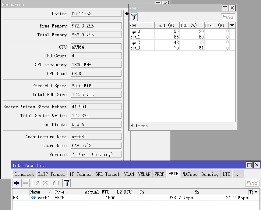 hAP ax3 带宽测试的CPU情况(1Gbps):