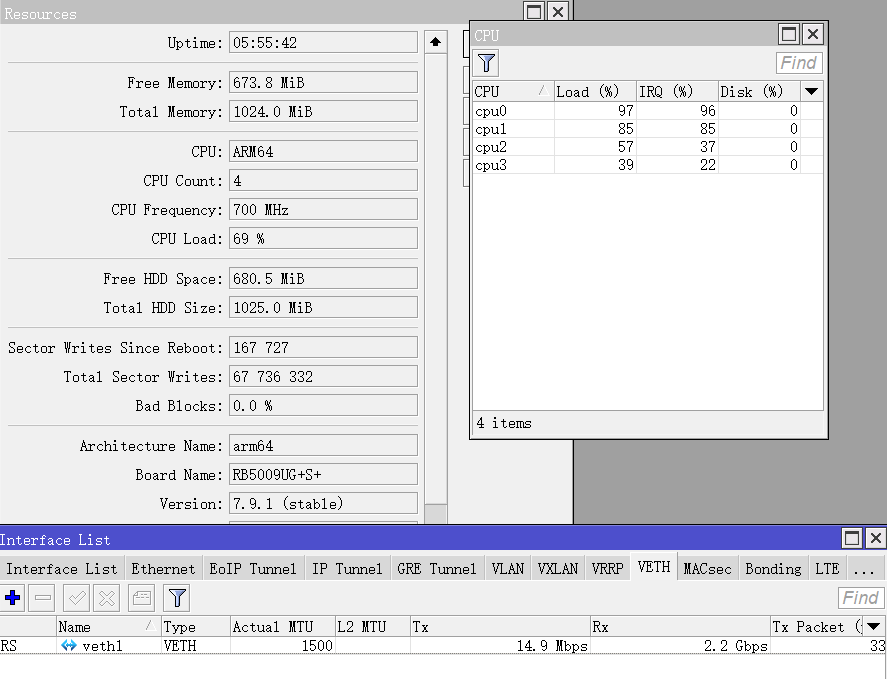 RB5009带宽测试的CPU情况(2.5Gbps):