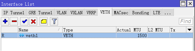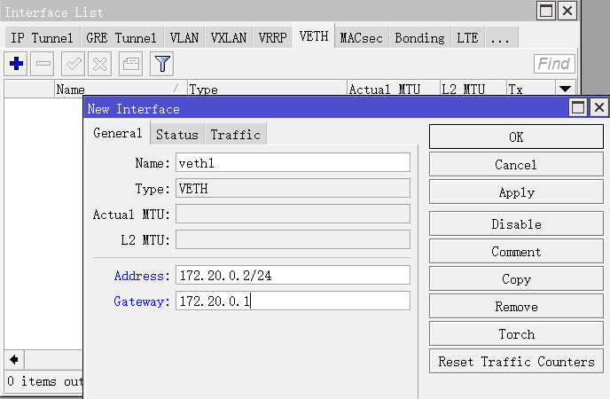 进入interface 创建veth接口,用于容器网口分配,规划的IP地址为172.20.0.2/24,设置网关172.20.0.1(IP地址规划根据自己实际情况配置)