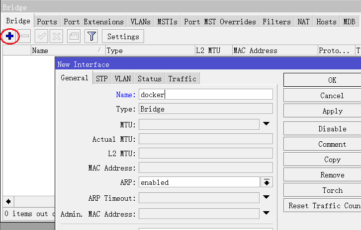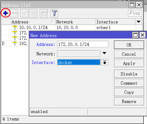 进入IP address添加docker桥接的IP地址,即所有容器的网关,这里设置172.20.0.1/24