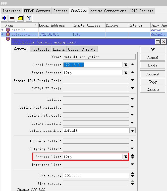 前面使用address-list定义流控IP地址,对于address-list地址列表的调用在很多地方会被使用,这些功能会动态的将来源IP地址加入到指定的地址列表,例如在使用PPP的隧道协议时,制定profile策略,可以选择address-list,一个账号登录成功后,会自动添加到指定的address-list,如下图: