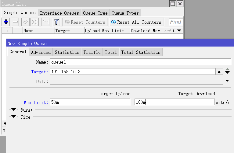 通过simple queue限制一个主机IP的上行50Mb,下行100Mb(bit),如下图的配置