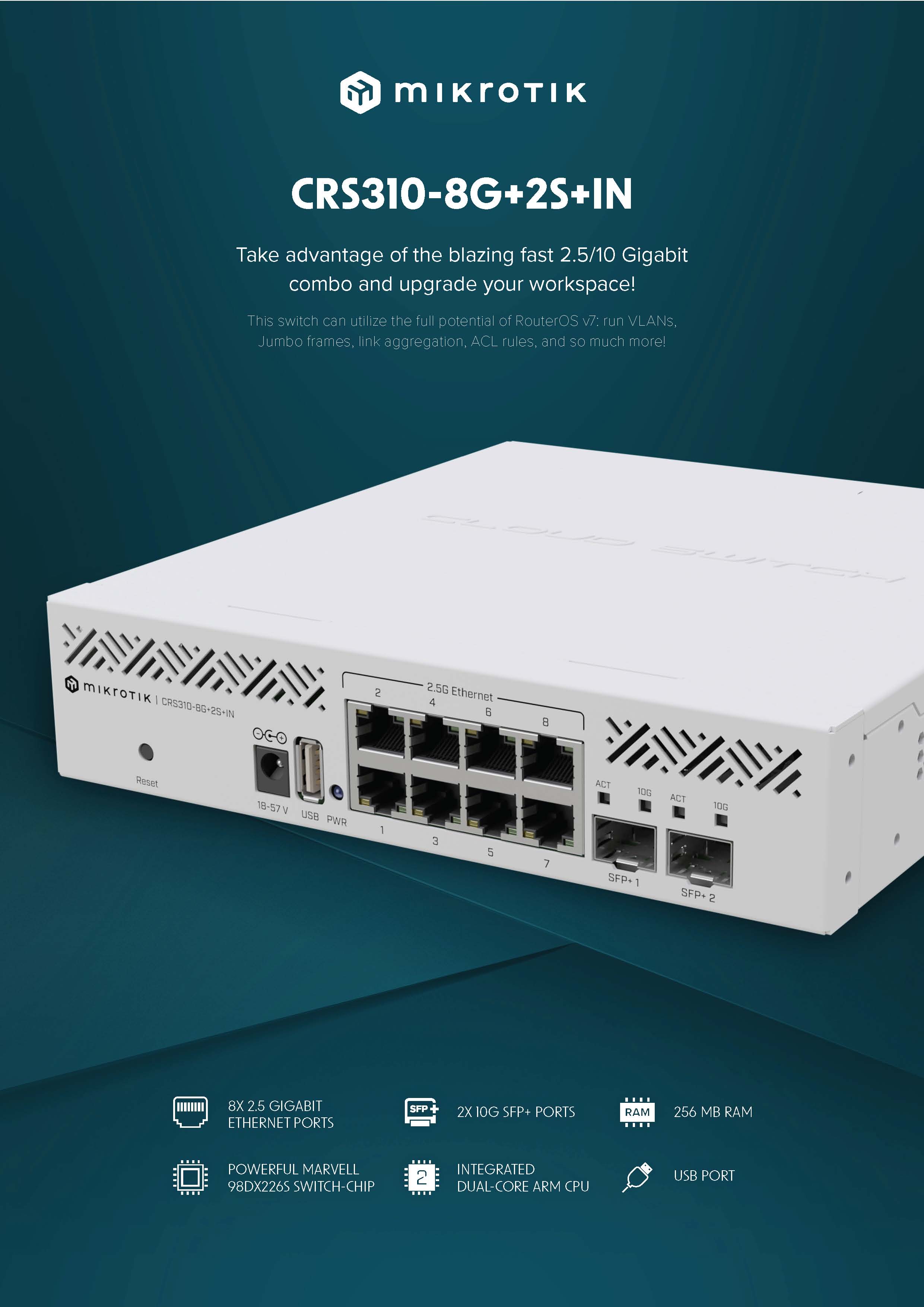 随着网络世界的不断发展,千兆连接正在快速的转向2.5G网络的连接。MikroTIkt推出CRS310-8G+2S+IN一款很有竞争力的2.5G网络产品,采用紧凑的外观集成8个2.5千兆以太网端口和两个10千兆SFP+端口,SFP+端口支持多种数据速率:1G, 2.5G和10G,因此可灵活设置成10 × 2.5G交换机。