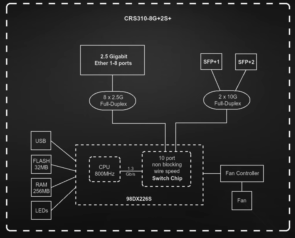 98DX226S是一颗SoC芯片,集成了双核的ARM v7 32位处理器 800MHz,集成了交换芯片,设计图可以看到8个2.5G端口和2个10G SFP+口统一在一个交换芯片处理,也就是二层转发是线速,官方说了支持三层Hw-offloading,通过配置三层VLAN的路由转发也是线速不会经过CPU处理(非NAT的硬件加速),到CPU的总线带宽是1.3Gbs,也就是说如果你用CRS310-8G+2S+IN做非L3 hw-offloading的路由转发也只能达到1.3Gbps,当然这个要CPU能抗住。基于RouterOS v7的系统完全不缺乏各种网络功能,采用ARM CPU应该是可以支持基于wireguard隧道的Back To Home应用。