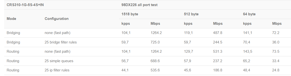 自带一个风扇算主动散热,ROM到了32MB,终于不是16MB,内存256MB作为交换机足够了,但这款交换机支持1个USB扩展(应该是USB2.0,但足够了),大大提升了功能扩展,如U盘存储,GPS,4G通信模块等。CRS310-8G+2S+IN是ARM处理器,通过测试U盘扩展存储后,可以支持Container。但从官方给出同类型芯片的CPU处理性能看(CRS310-1G-5S-4S+IN),并不理想,双核心ARM v7 32位处理器 800MHz,不应该那么低,还不如hAP lite,有点不理解,感觉官方这个测试只用到了一个核心。