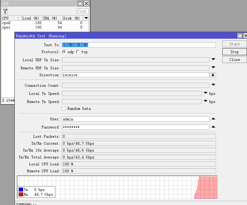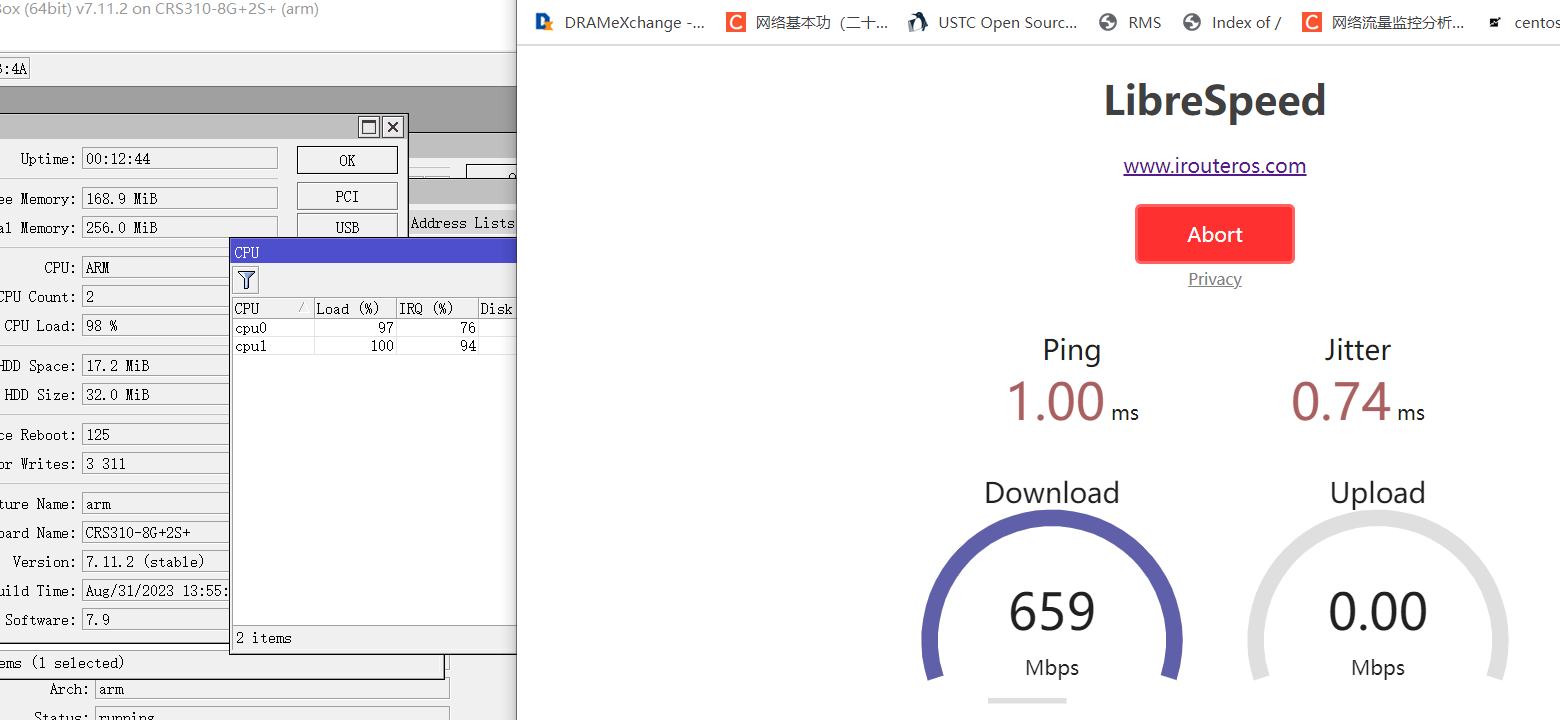 能到48G,CPU满负荷运转(参考:hAP ax3能到267G左右)