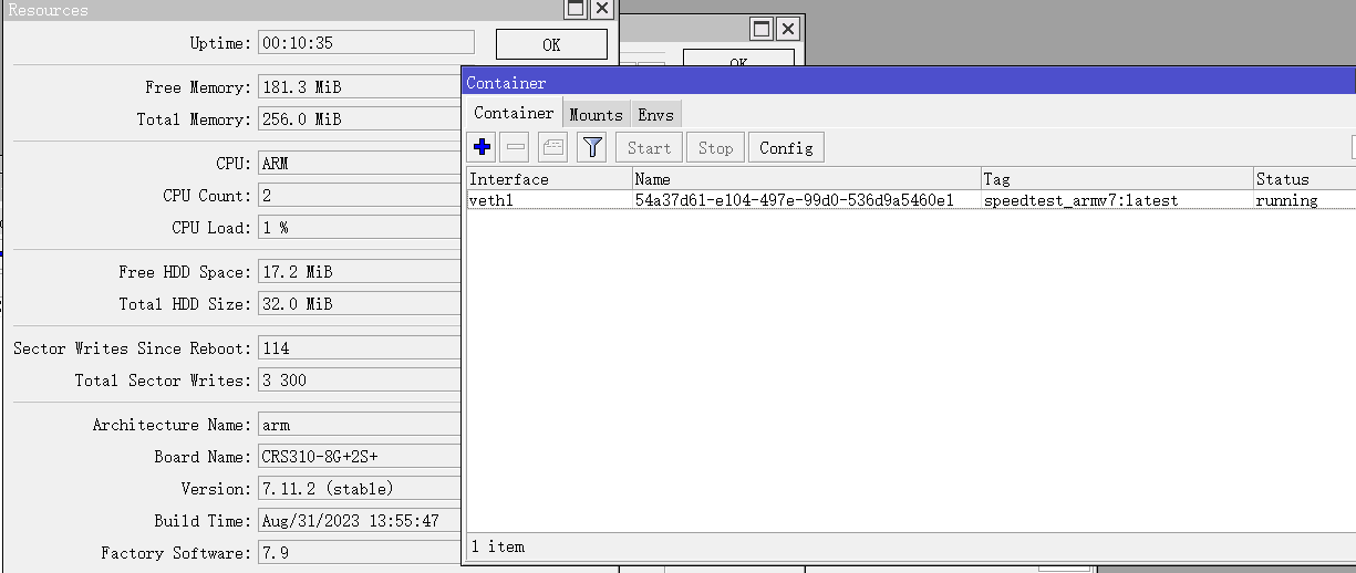 采用ARM的处理器,内存256M是支持Container,由于本地存储只有32M,需要通过USB扩展一个U盘用于文件存储,运行Librespeedtest(需要安装container扩展包)