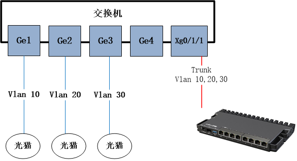 下面的实例基于划分VLAN的方式进行拨号,pppoe接入在交换机上都设置一个单独的VLAN ID,然后通过trunk到RouterOS的sfp-sfpplus1接口,创建VLAN子接口后,进行拨号。