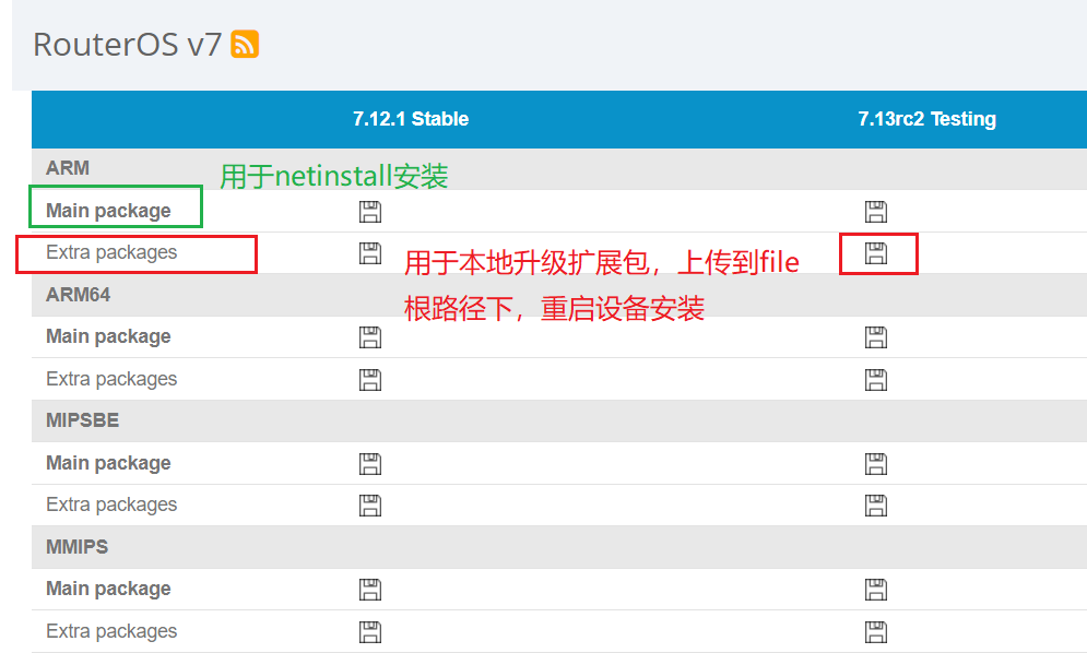 下载扩展包的方法是访问https://mikrotik.com/download ,然后选择要下载的RB设备版本,比如hAP lite的Architecture Name是smips,在页面找到即可,下面截取的是ARM构架如hAP ac2/cAP ac,main package是用于netinstall安装,extra packages就是扩展功能包,如下图: