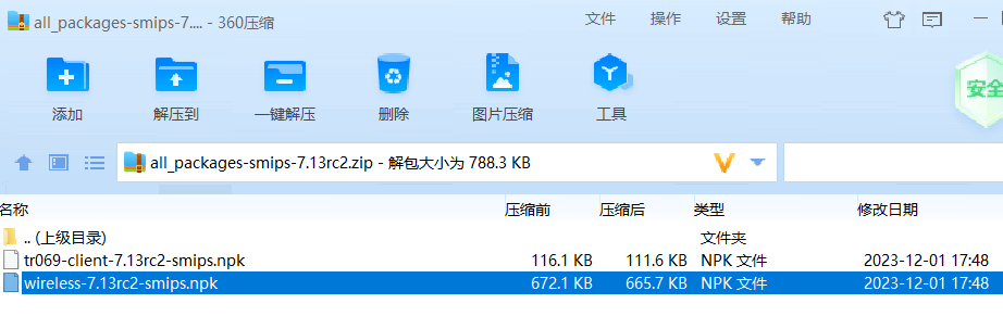 下载extra packages,我下载的是hAP lite扩展包,是一个all_packages-smips-7.13rc2.zip文件,构架是smips,打开可以看到wireless包:
