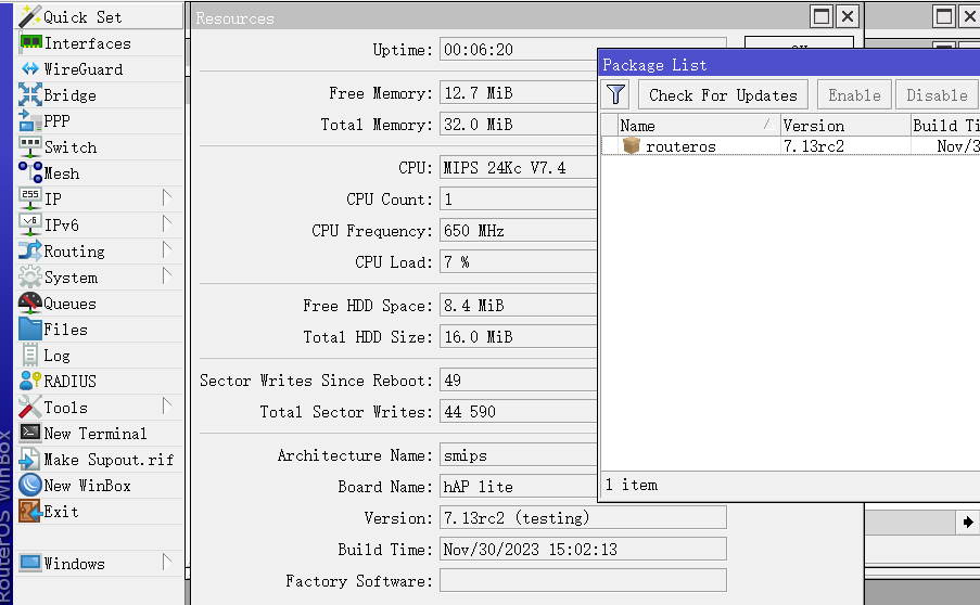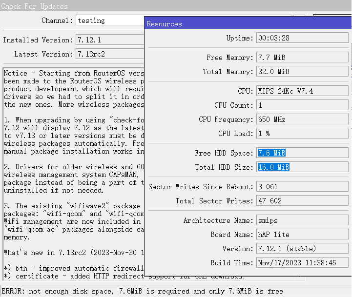 RB924i-2nD-BT5&BG77(KNOT)升级测试,先升级到7.12.1,然后在线升级检查development还是testing都无法解析到,由于安装了iot,gps等功能包,不清楚是否和剩余空间只有1MB有关系。 在hAP lite上测试,升级会提示需要的升级空间不足