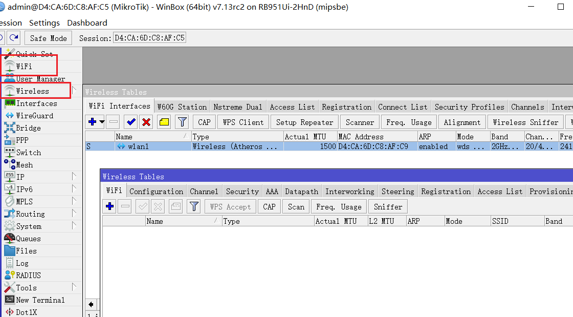 具体我们可以看到两个关于无线配置菜单一个旧的Wireless和一个新的WiFi,在RB951Ui-2HnD上升级后,2.4GHz的无线网口管理仍然在Wireless包下面