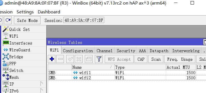 “WiFi”配置菜单是在RouterOS 7.13中引入的,是一个用于管理Wi-Fi 5 wave2和更新的WiFi接口的RouterOS功能包。wireless设备的兼容需要'wifi-qcom-ac'驱动程序包(用于802.11ac芯片组)或'wifi-qcom'驱动程序包用于802.11ax和更新的芯片组。