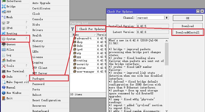 RouterOS已经支持在线免费升级,升级仅需要在线点击"Check for updates" ,并点击"Download&Install"按钮,重启即可升级,无需太复杂的操作,我们强烈要求大家尽快升级到v6.42.1以后的版本,升级完成后修改管理密码。升级操作时确保RouterOS网络连接和DNS配置正确。