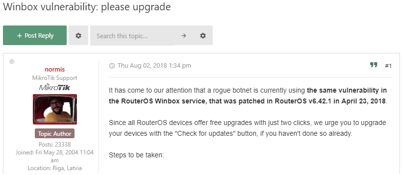 MikroTik官方在8月2日,再次在官方论坛发布了漏洞升级提醒通知。