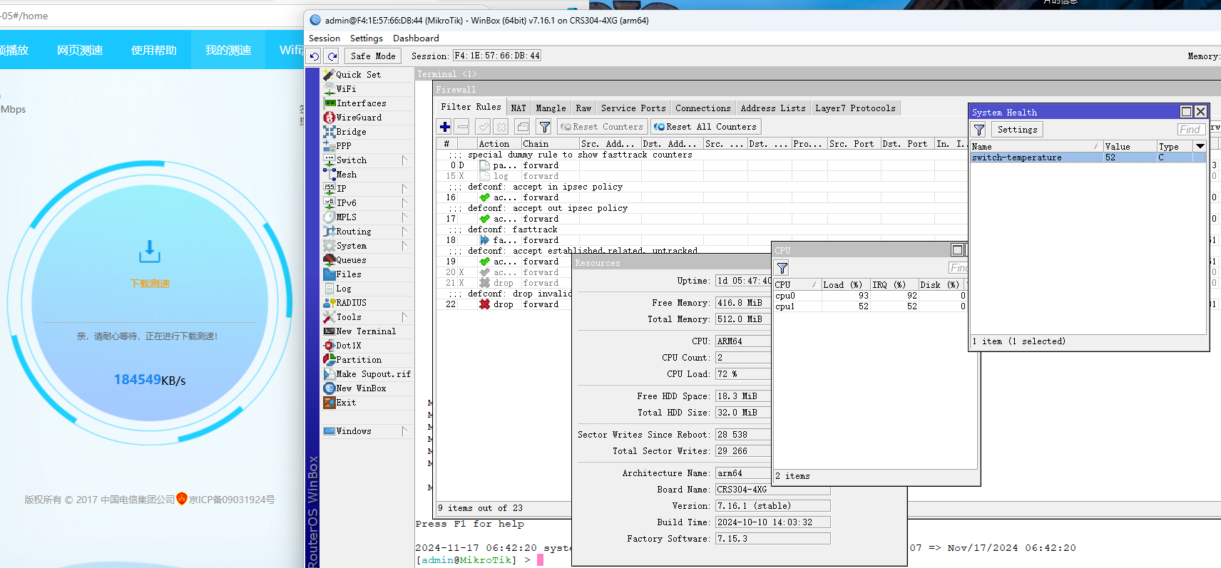 用电信宽带的官方测速,家里带宽是千兆,中兴2.5G光猫,使用官方默认防火墙规则,开启fasttrack,配置一条masquerade的nat规则,电信带宽能测速到1.25Gbps,CPU在72%,不开启fasttrack,带宽在850Mbps左右,cpu 100%,作为千兆路由器还能接受!目前看是CRS系列中CPU性能排在第二位。