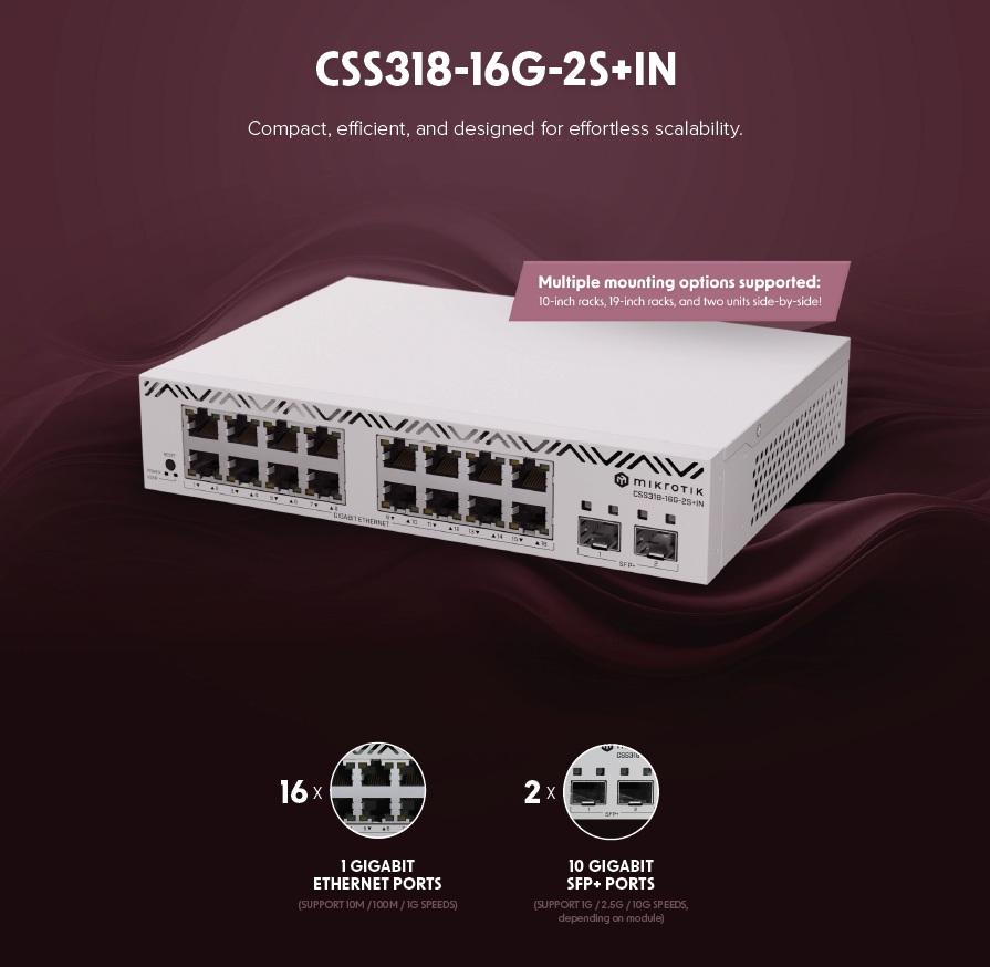CSS318-16G-2S+IN的设计更适合那些因24端口太多,但8端口不够的网络。其紧凑的10英寸外形尺寸和经济高效的设计使其成为中小型办公室,家庭网络的理想解决方案