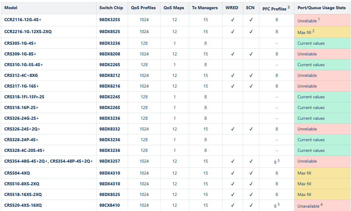 对于MikroTik CCR和CRS系列支持的交换机请对比下面的列表,需要支持ECN和PFC Profiles