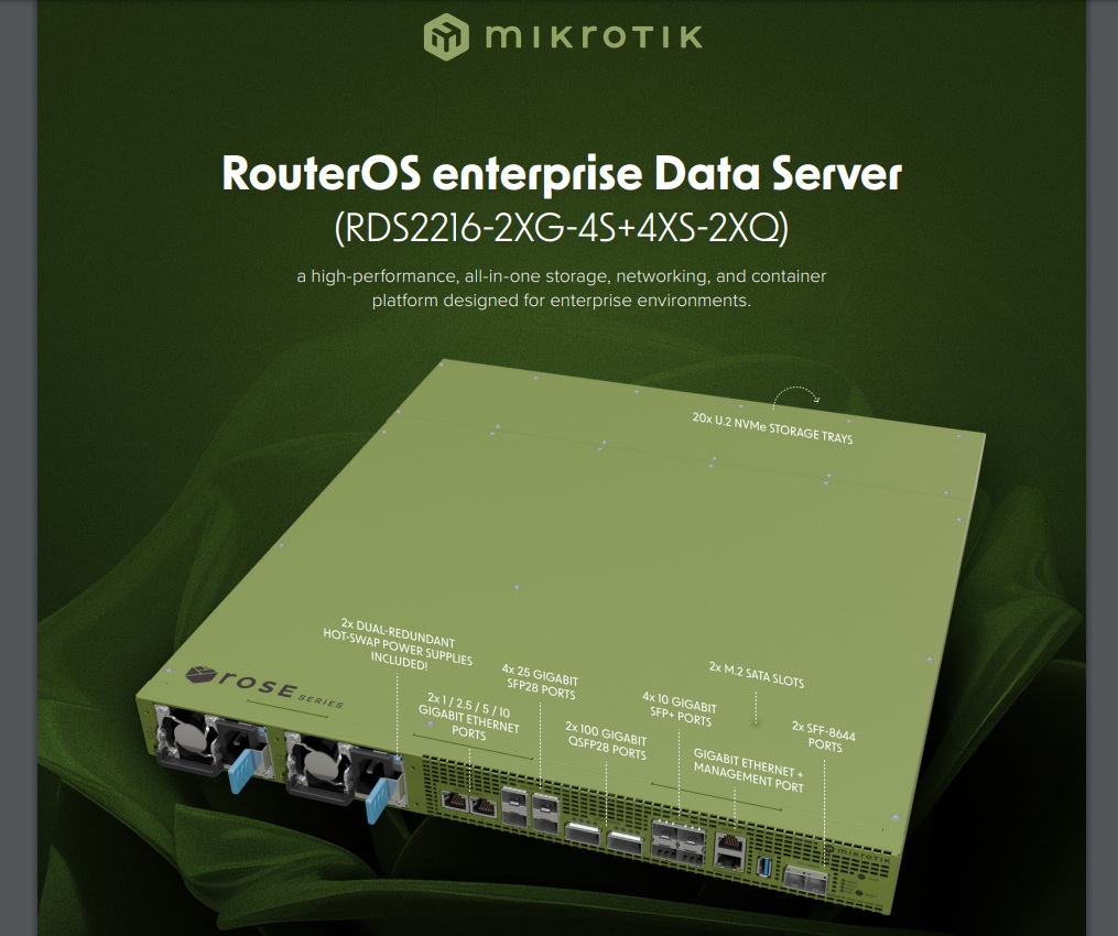 MikroTik 发布RDS2216-2XG-4S+4XS-2XQ企业存储路由器,因为是CCR2216-1G-12XS-2XQ的企业存储的演变版本,一个专为企业级环境设计的高性能一体化存储、网络及容器平台。