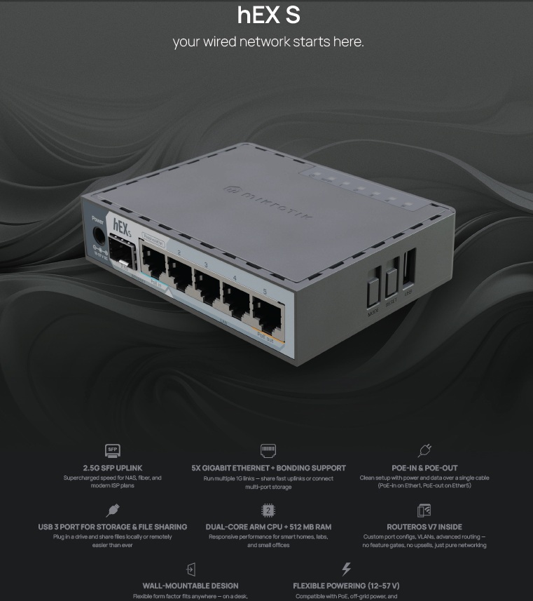MikroTik发布了新款的hEX S(E60iUGS),采用EN7562CT 950 MHz处理器,RAM 512MB,ROM 128MB,1个2.5G SFP光口,5个千兆电口,一个USB3.0,ether1支持PoE输入,ether5支持PoE输出。