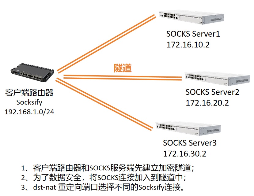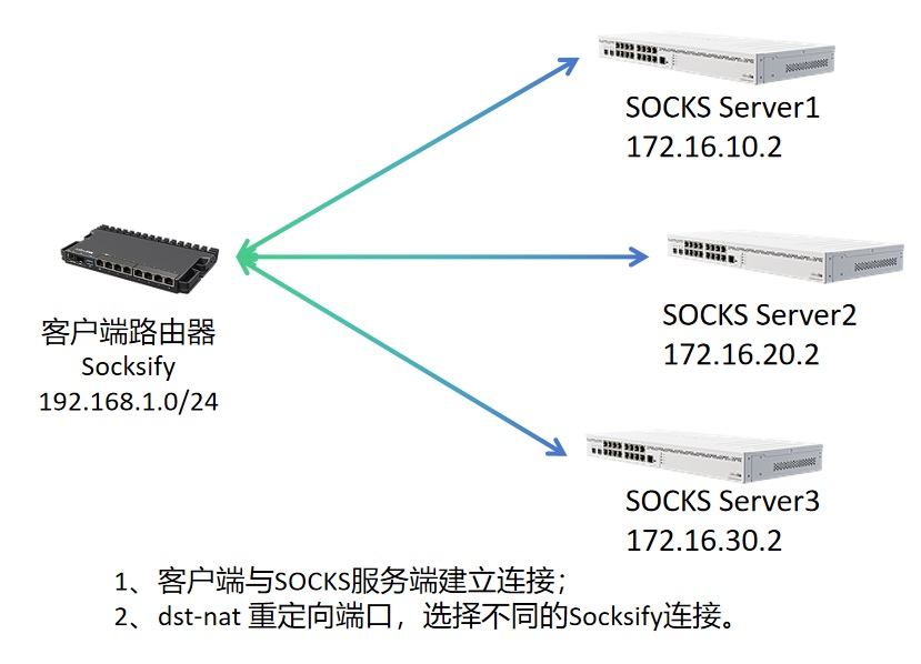 考虑到有多个SOCKS代理服务节点,如何通过Socksify去同时连接不同的节点,并将内网不同主机重定向到指定的SOCKS代理,由于Socksify不涉及三层路由配置,只涉及dstnat操作所以。一些大型企业多地有服务,服务之间的内部Web服务考虑数据安装,需要使用加密隧道,还会涉及到隧道的搭建。 首先通过3个SOCKS代理节点作为示例,不考虑加密隧道,如下图: 如上图,有3个代理节点SOCKS Server1,SOCKS Server2和SOCKS Server3部署到公网网络都有可以直接访问的公网IP,客户端路由通过Socksify同时连接3个节点,将192.168.1.0/24内的主机根据需要分配到不同的3个节点。每个代理节点使用SOCKS v5协议,端口为TCP 1122,启用账号认证功能。 以下配置通过命令行操作