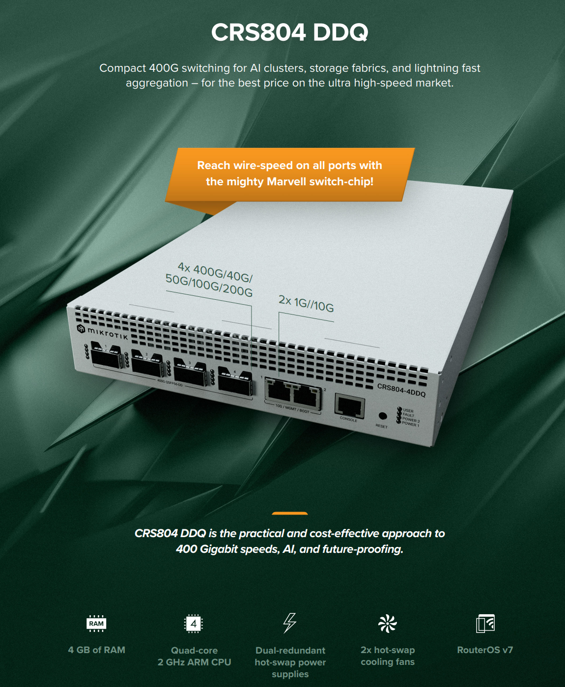 MikroTik推出了一款4x400G的交换机,其设计思想还是基于AI实验室、科研环境的小型机架部署场景,也能用于核心网络的汇聚场景