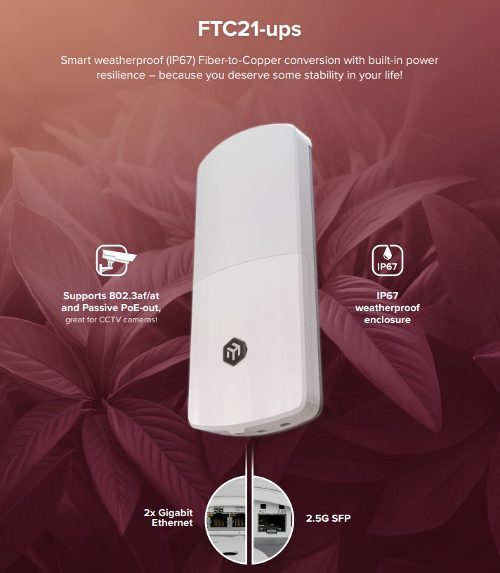 MikroTik FTC21-ups (IP67) 光纤转铜缆交换机(内置电池)。在网络边缘,故障率较少的是光纤。不稳定的电源、电压骤降、短暂中断和电压下降才会触发设备重启和不必要故障工单处理。FTC21-ups 专为应对不可靠电源问题而设计,旨在为省去一些大麻烦。