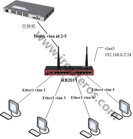 下面我们以RB2011Ui路由器为例,如何在RouterOS里基于交换芯片配置VLAN的trunk和access,在这个实例中,sfp1接口作为trunk口,上联一台管理交换机,ether1-ether4作为access口