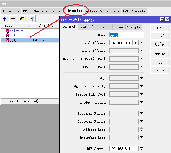 首先在profile创建新的规则pptp,只分配local address和dns两个参数,如果要做流控在limits菜单下设置limit参数