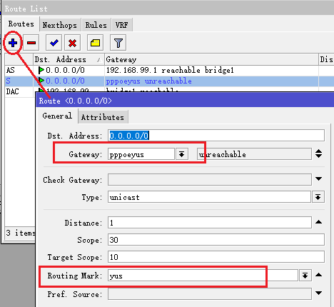 add distance=1 gateway=pppoeyus routing-mark=yus