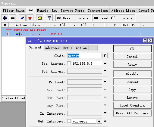 在ip firewall nat下创建srcnat规则,设置src-address为192.168.8.2,out-interface为pppoeyus,action=masquerade