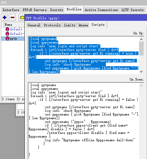 以上条件配置完成后,在Profile中选择新创建的PPTP规则,打开scripts菜单,针对on up和on down两个状态添加联动脚本,如果有拨号请求或者中断,都会触发这里的脚本运行。