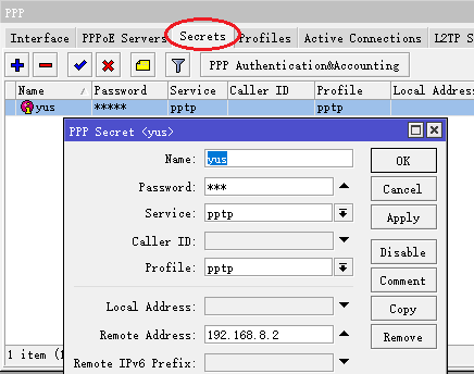 add name=yus password=yus profile=pptp remote-address=192.168.8.2 service=pptp