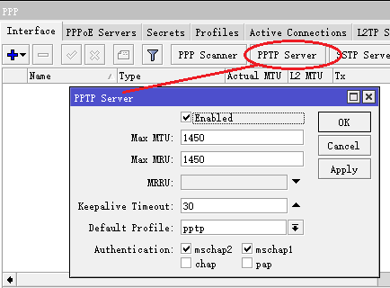 配置一、开启RouterOS的PPTP服务,并创建一个新的profile规则