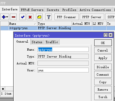 设置name为pptp-yus,user对应yus账号,这样yus账号会以静态方式一直存在,而非默认拨号连接后动态创建。