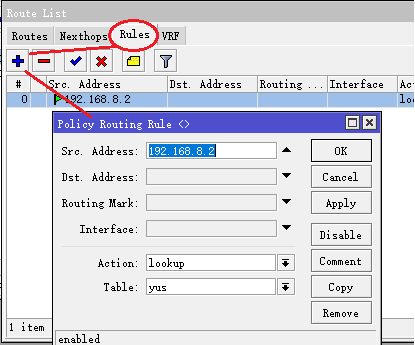 下面是策略路由规则,在/ip route rules下将之前yus账号的分配的IP地址192.168.8.2,添加到src-address中,并创建一个路由表yus