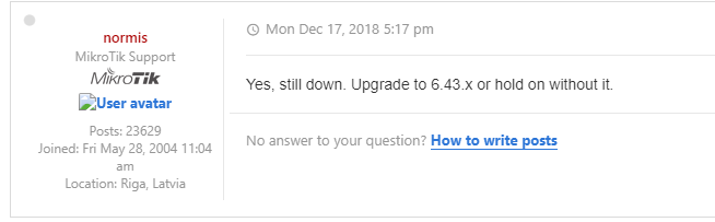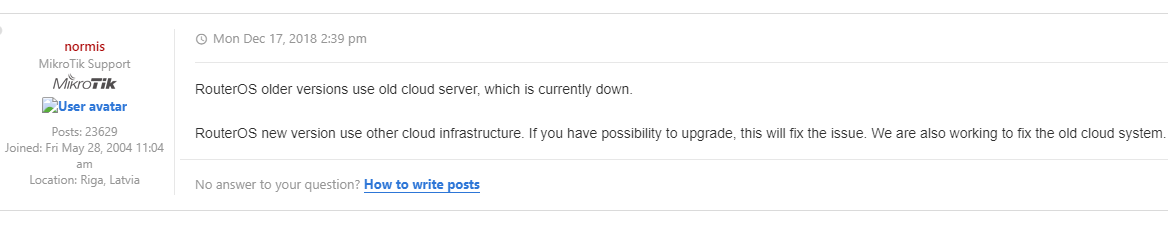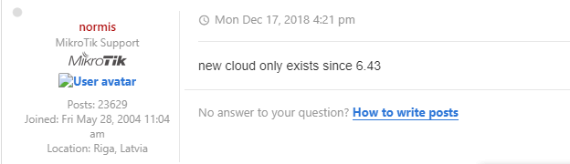 意思就是,RouterOS 6.43版本前的ip cloud功能有bug,暂停服务器,什么时候恢复未知,如果要使用ip cloud服务请升级到6.43以后的版本