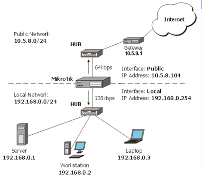 这里我们使用(simple queue)简单队列,首先我们配置RouterOS的IP地址、网关和NAT等基本网络参数: