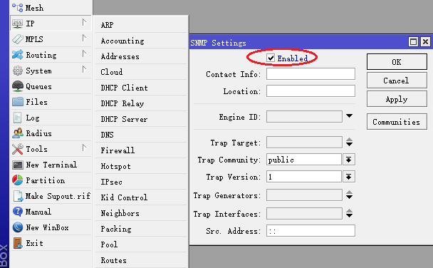 启用RouterOS SNMP,进入snmp目录,通过print查看当前snmp配置,通过set命令启用