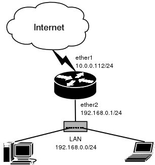 参考下面的一个简单的网络,外网接口是ether1(IP地址10.0.0.112/24),内网接口是ether2(IP地址192.168.0.0/24)