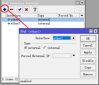 [admin@MikroTik] ip upnp interfaces> enable 0,1