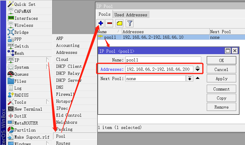 添加DHCP服务前,首先需在/ip pool中分配地址池范围,注意添加时要排除网关地址: