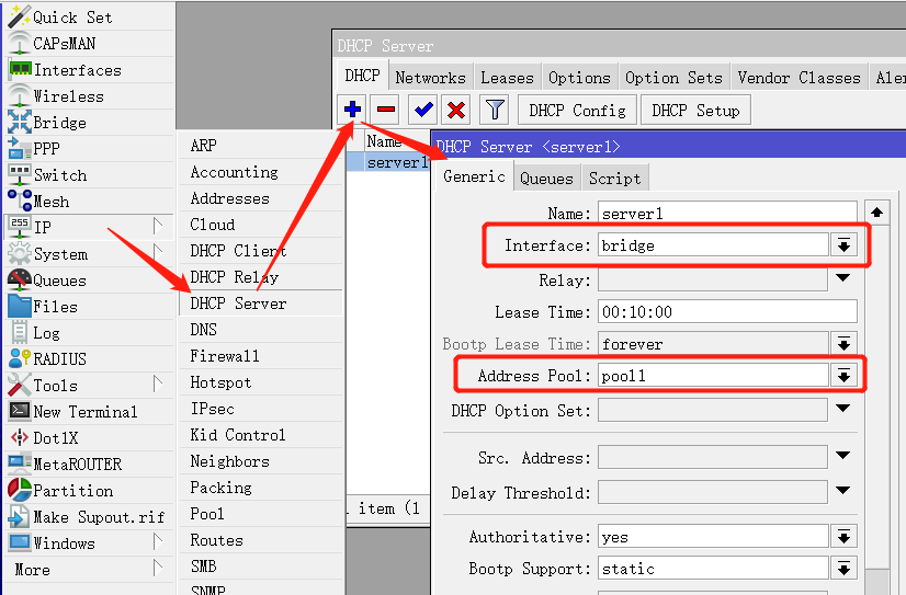 进入/ip dhcp-server添加DHCP服务接口到bridge和对应的pool1地址池