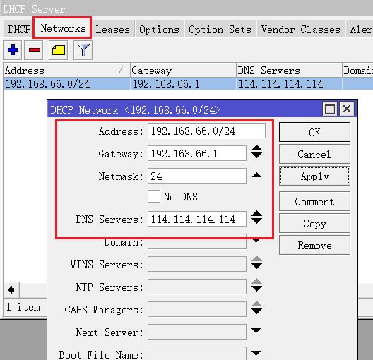 在/ip dhcp-server network中新建规则,address参数限制该bridge接口只能是网段192.168.66.0/24(该参数在多网卡下配置多个DHCP服务器起作用,用于区分不同网卡下的不同IP地址),然后分配网关、子网和DNS参数: