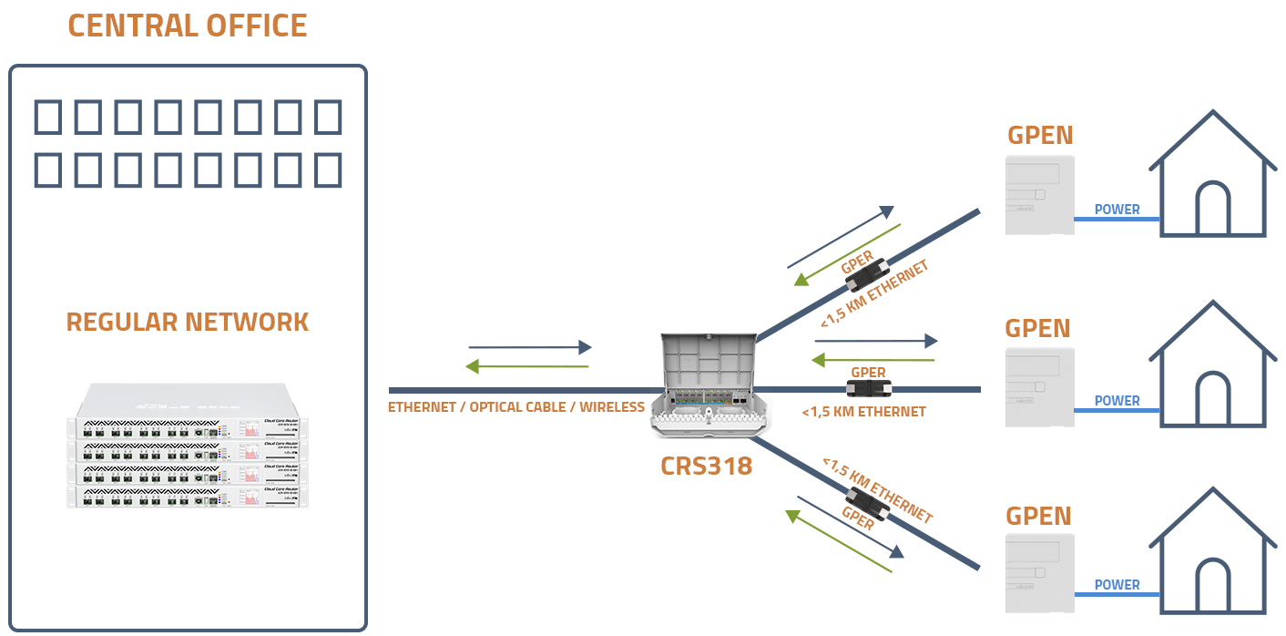 GPEN网络最主要的一个组网方式就是让每个终端家庭,为这个GPEN网络供电,首先家庭需要安装GPEN11或GPEN21,通过GPEN11或21为CRS318-16Fi-2S供电,如果距离长了就使用GPER中继,最长距离1.5km,CRS318-16Fi-2S再与中心机房连接。