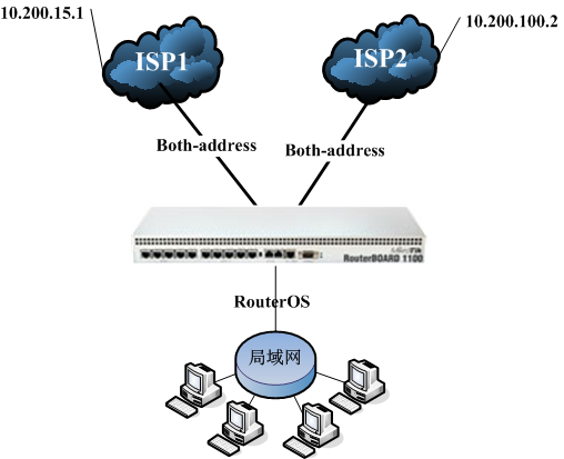下面的事例,是一个双线的PCC负载均衡策略事例,这里立两条WAN出口分别是wan1和wan2,网络结构如下:
