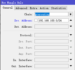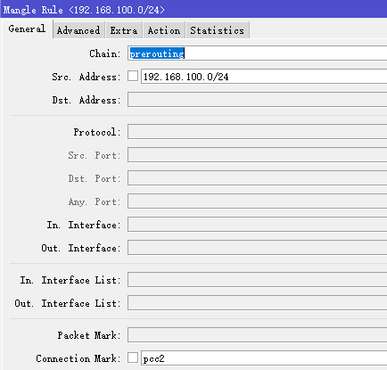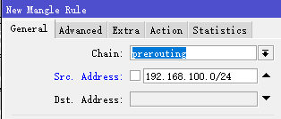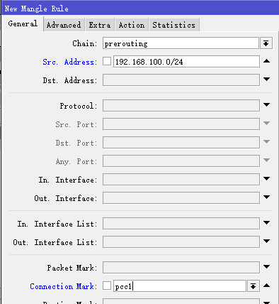 首先,在prerouting链表,标记第一条PCC连接标记策略,设置src-address=192.168.100.0/24